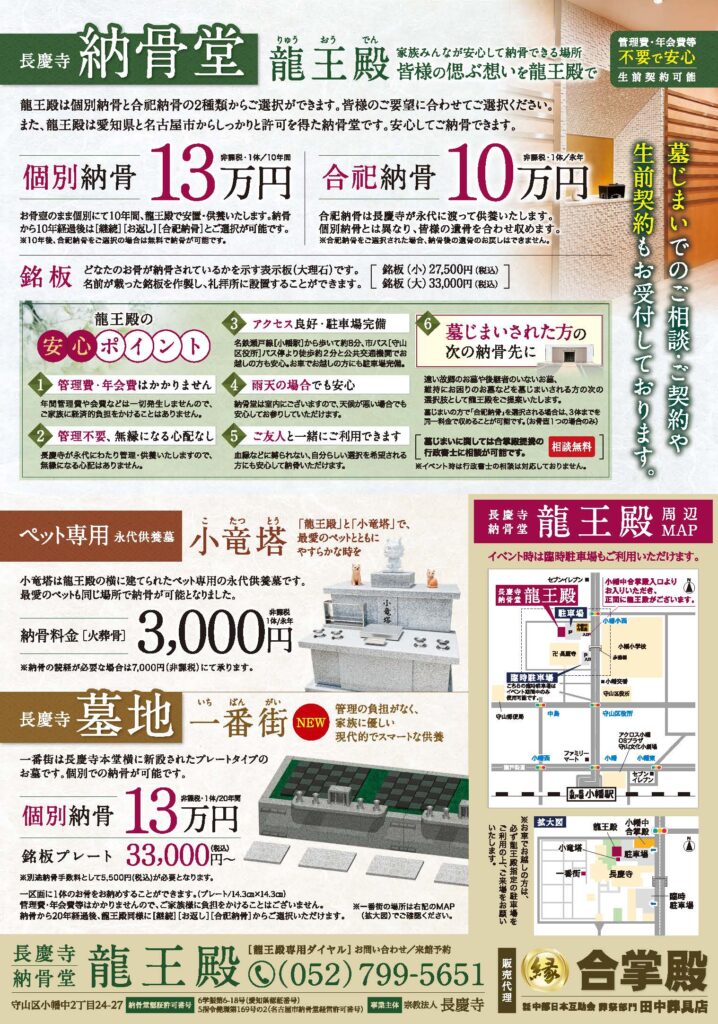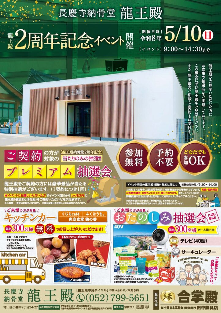 弊社が販売代理を行っております長慶寺納骨堂龍王殿の2周年を祝し、龍王殿2周年記念イベントを開催いたします。